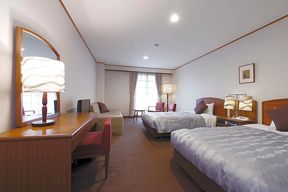 This twin room features a private open-air bath. The air-conditioned twin room features a flat-screen TV, soundproof walls, a tea and coffee maker, a wardrobe as well as mountain views. The unit has 2 beds.